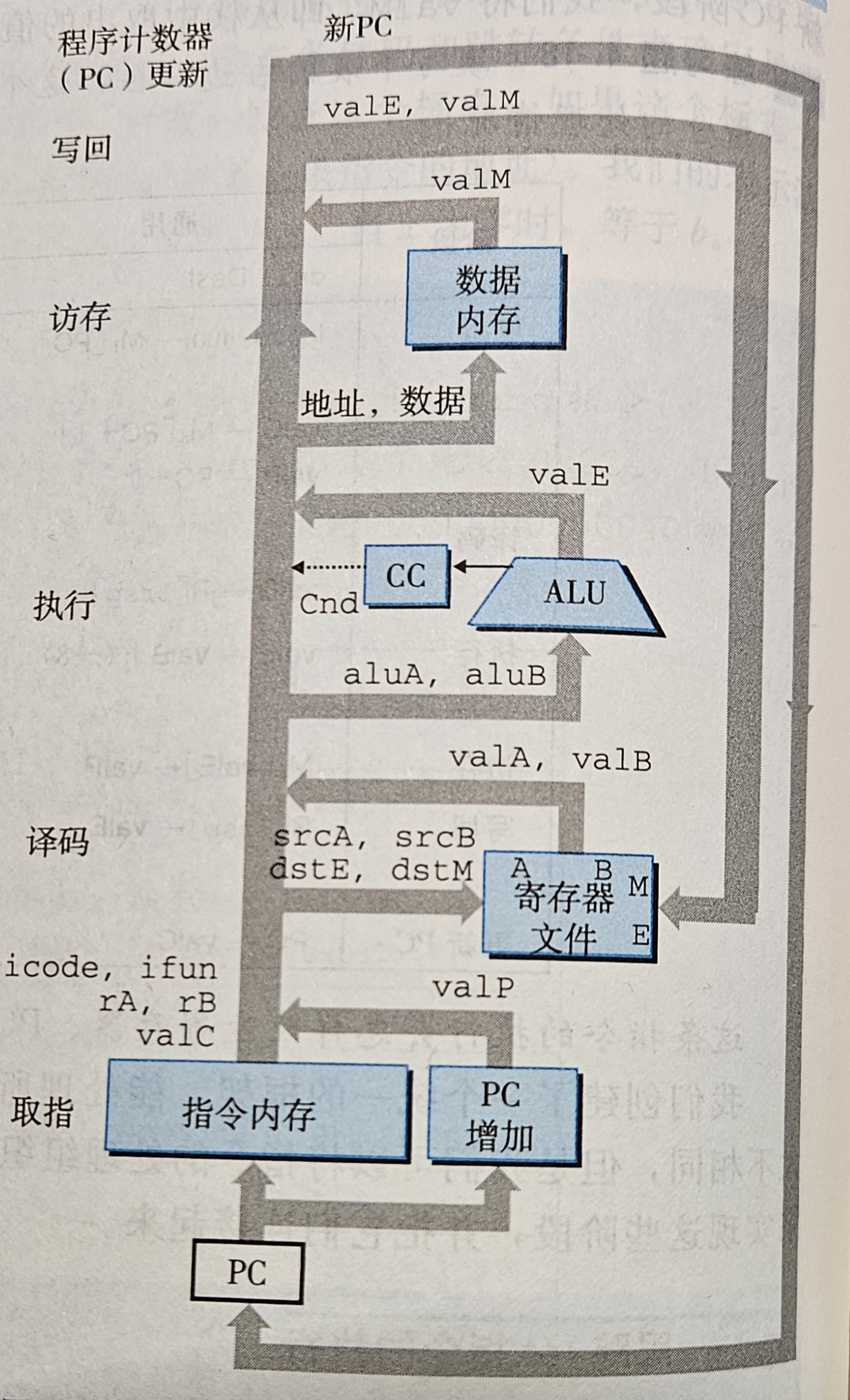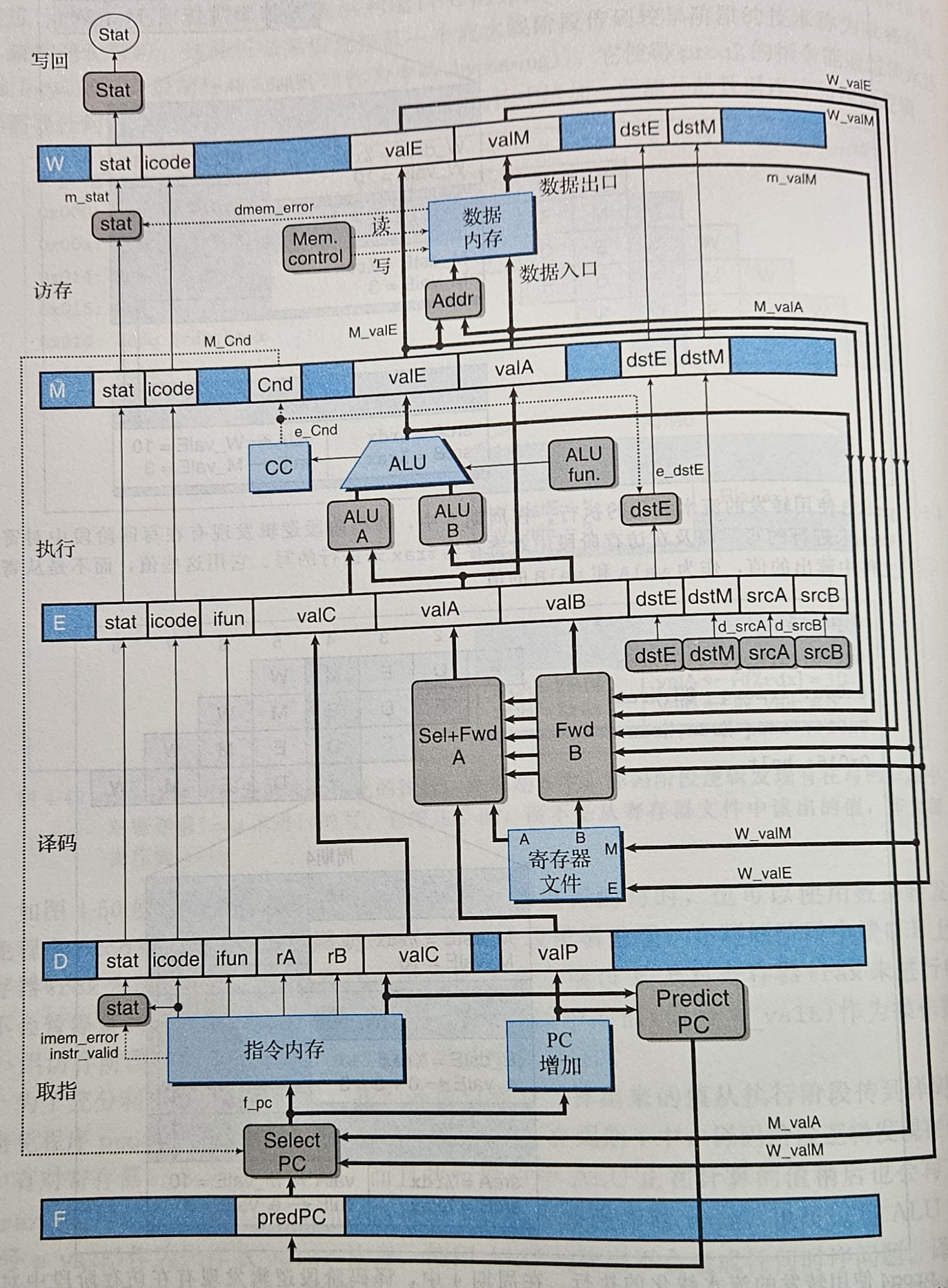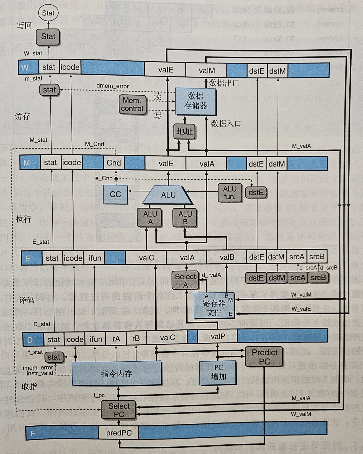 - 当一条指令导致了一个异常,而后面的指令已经更新了处理器的状态,比如 pushq %rax,此时的 %rsp 为 0x0000000000000000,那么 pushq 指令就会向 0xfffffffffffffff8 中插入数据,但是这会在访存阶段导致一个异常,如果后面紧跟着一条 addq 指令,那么指令就会在执行阶段更新 CC,但实际上并不应该对 CC 进行更改。所以我们应该要能够发现出现了这个异常然后停止执行。