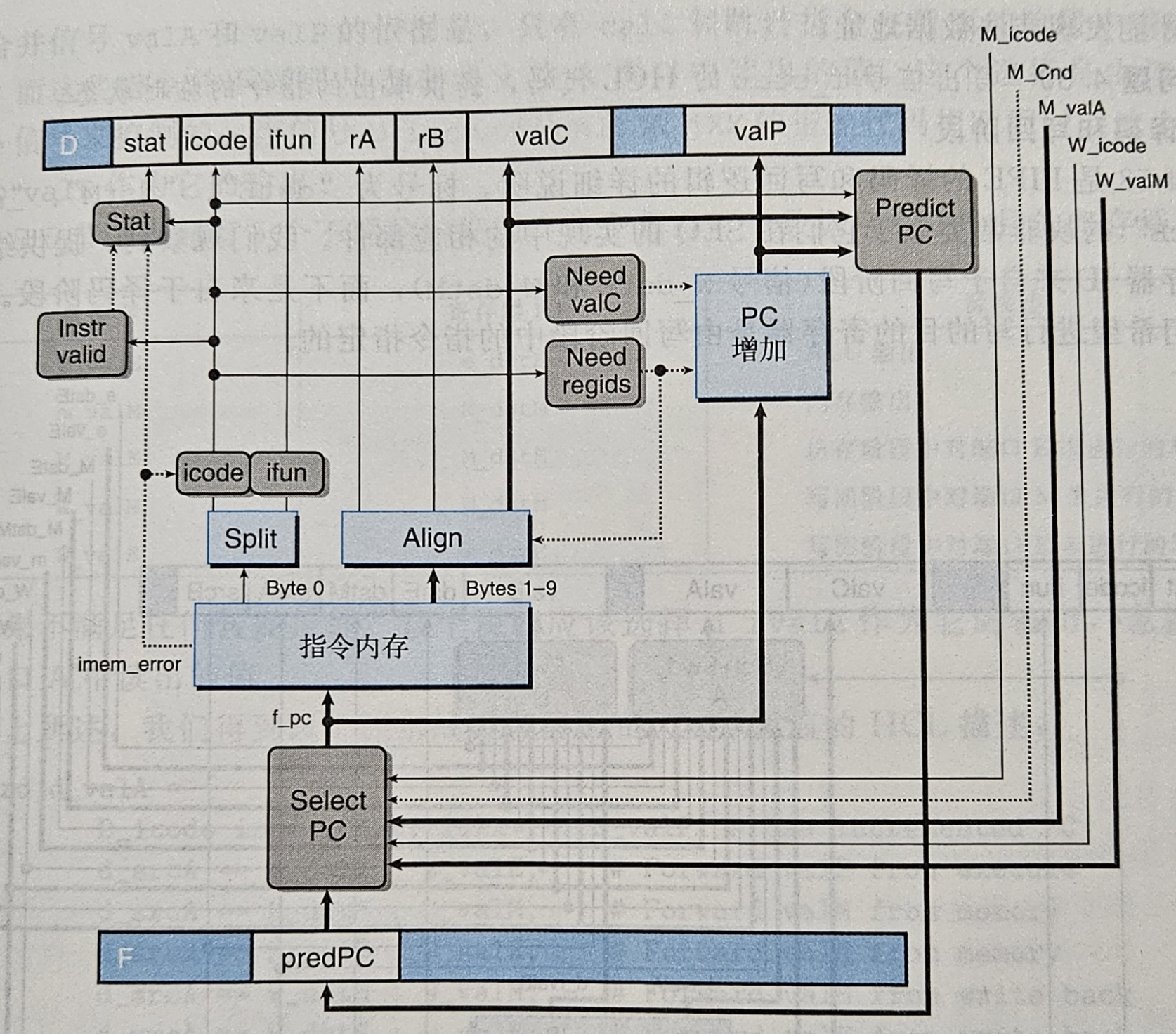 - W 保存访存阶段后的指令的信息以及从内存中读取的值,用于写回阶段和更新 PC