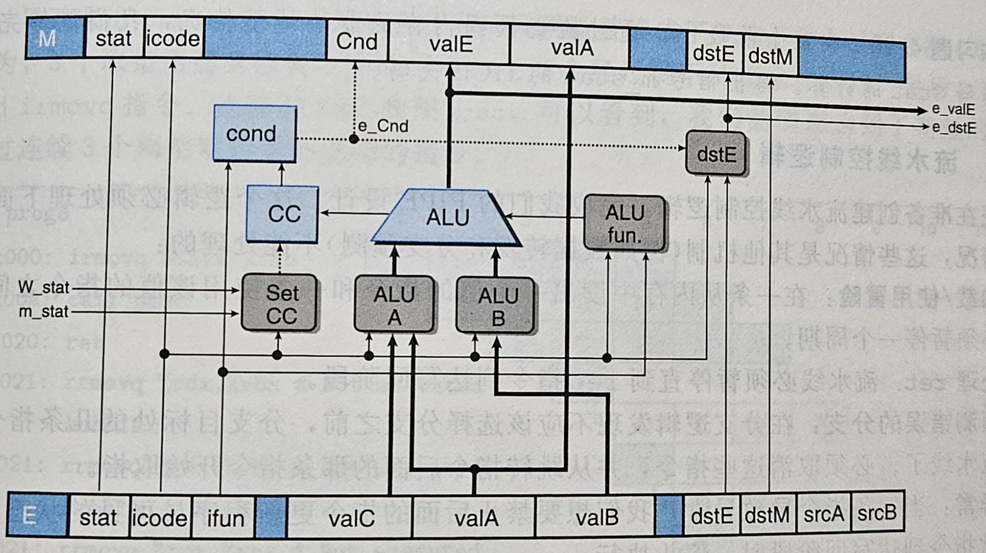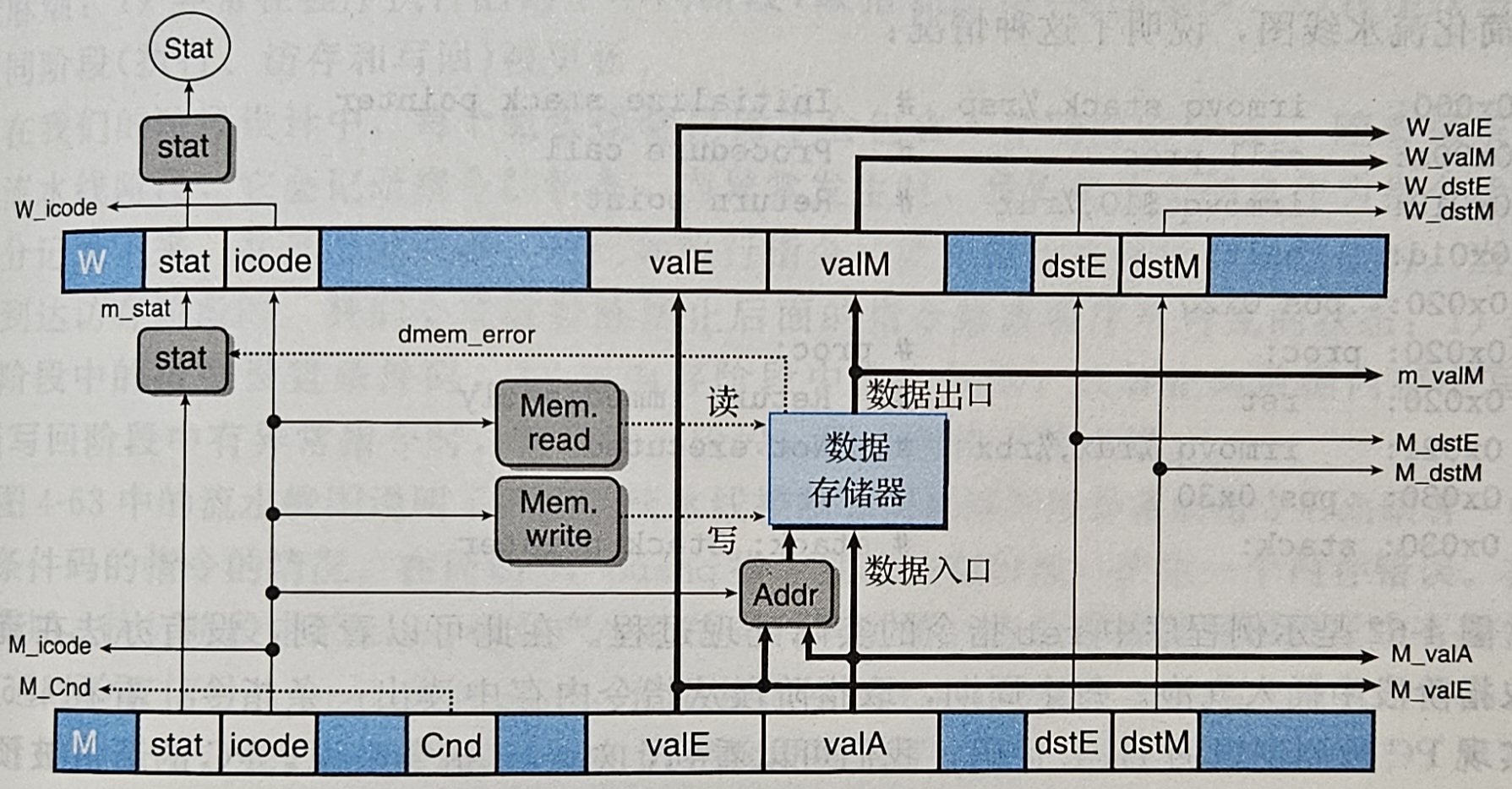 - M 保存执行阶段后的指令的信息以及 ALU 计算结果和条件码,用于访存阶段