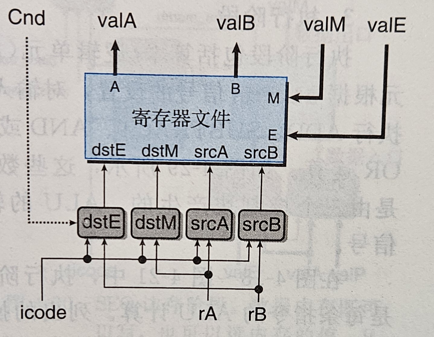 当流水线进行到第 4 个周期的时候,addlq 正处在 D 阶段中,此时第一条 irmovq 指令正在 M 阶段,它的 M_valE 的值是 10,第二条 irmovq 指令正在 E 阶段,它的 e_valE 的值是 3,所以我们可以在这两个信号处搭建旁路将信号转发到 D 阶段中,这样 D 阶段就能将正确的值写入流水线寄存器中,所以我们需要一个控制器来发现数据冒险然后选择使用转发过来的信号,解决数据冒险,同时为了保证泛用性,我们会将更多的信号进行转发,最后我们会将 e_valE、m_valM、M_valE、W_valM、W_valE 这五个信号进行转发,所以最后的设计如下:
